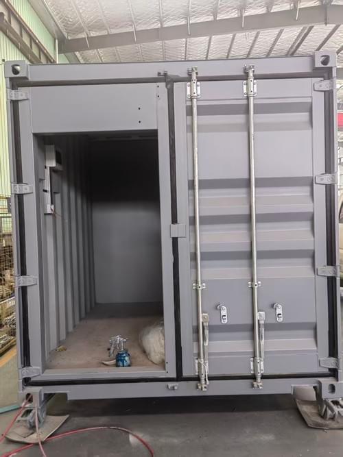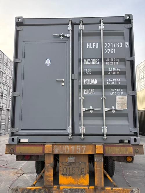 En complément de la zone sanitaire, le conteneur dispose d’un espace de stockage sécurisé, cet espace est accessible via une porte intégrée directement dans la double porte d’origine du conteneur, garantissant une facilité d'ouverture et d'utilisation quotidienne.